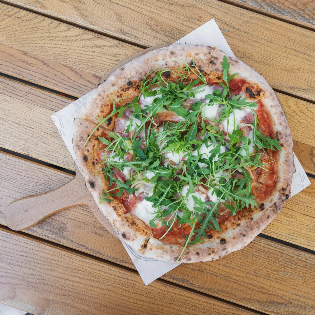 paradicsom, pancetta, parmezán, mozzarella, vöröshagyma, extra szűz olívaolaj, rukkola